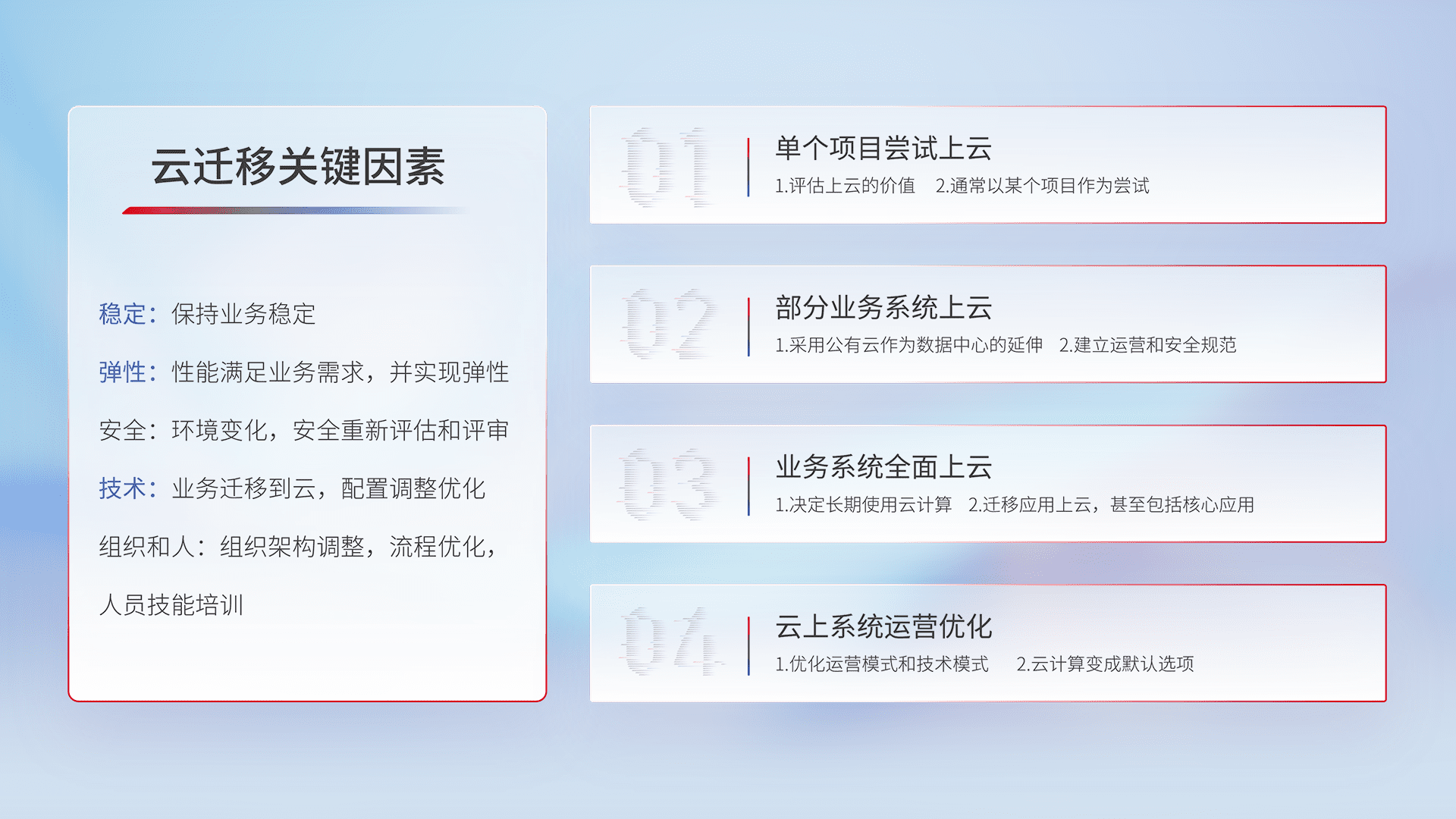 结合实际业务,,从规划设计、、、、云平台选型、、云原生改造、、数据迁移、、集成交付,,,,迁移全过程为客户识别最佳上云路径,,做好风险识别管理,,,设计网络架构、、、身份权限、、、安全审计合规、、操作审计、、日志审计、、监控告警策略、、、多站点容灾设计等,,对云上基础设施进行整体规划,,,提升IT治理水平,,,以满足弹性、、高可用、、、高性能的需求。。