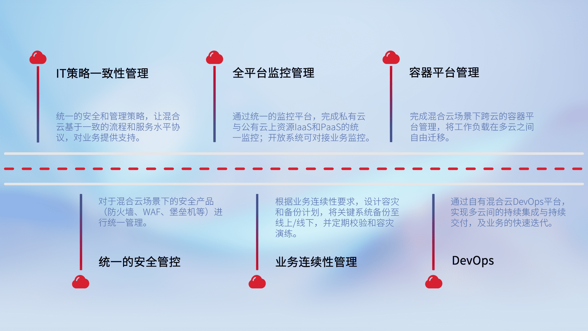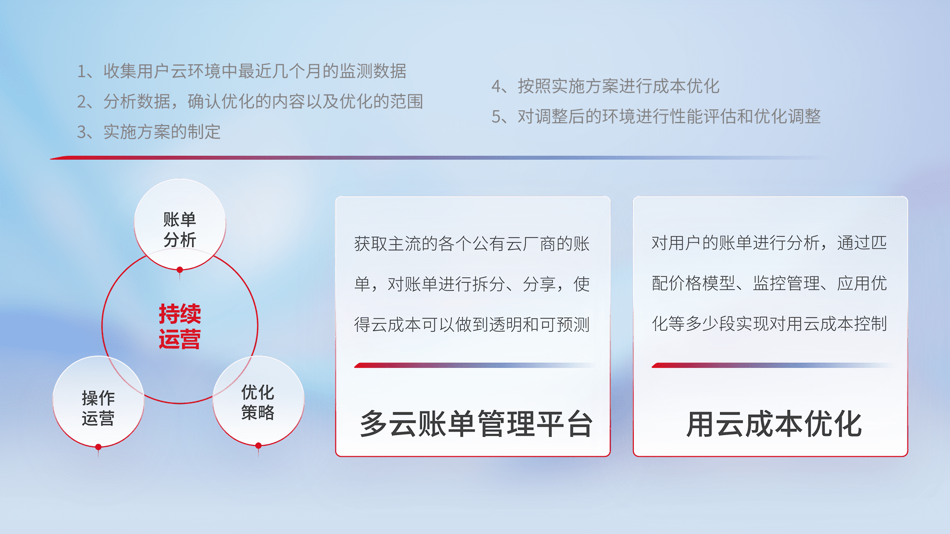 通过多云纳管,,以统一的资源数据模型把客户的云资源进行抽象和封装,,,,进而实现对多云资源的统一操作,,,保障云资源管理的可靠性、、稳定性与可用性。。。量身定制化运维内容,,,,配置、、开发运维、、、、补丁管理、、备份、、、监控、、认证和访问管理、、、、审计和日常巡检等,,,,保障在用云过程中的可靠度,,,,稳定度以及高可用率。。
