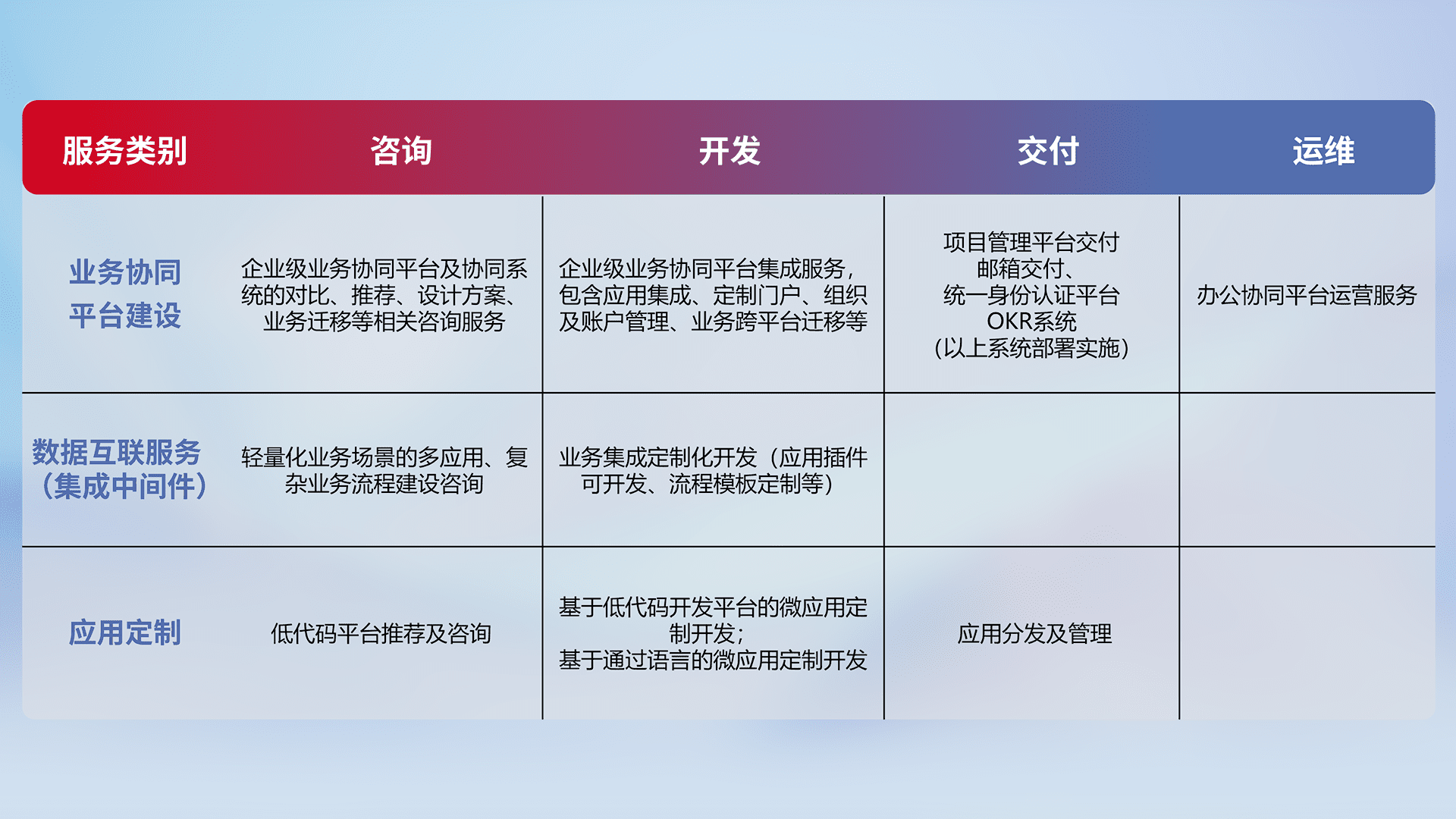 针对钉钉、、企微、、IDaas等平台级产品提供产品的规划、、、方案、、交付、、、定制化开发等服务,,,实现如统一协同办公、、、智能客户服务、、、、混合会议管理、、、智能数据查询、、、、等业务场景,,,实现数字化转型。。